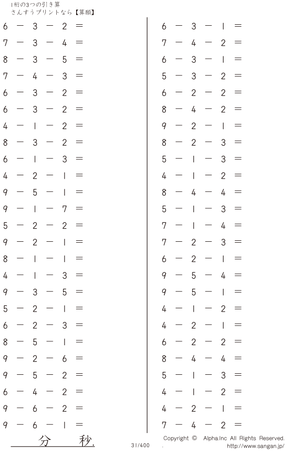 上記のボタンから「1桁の3つの引き算」の算数数学ドリル・計算ドリル(PDFプリント)がダウンロードできます。個人利用は無料です(家庭以外での配布は有料です)。