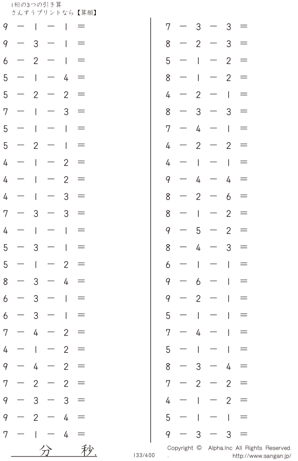 上記のボタンから「1桁の3つの引き算」の算数数学ドリル・計算ドリル(PDFプリント)がダウンロードできます。個人利用は無料です(家庭以外での配布は有料です)。