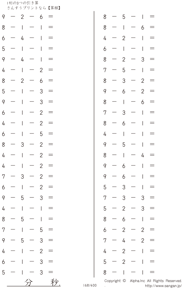 上記のボタンから「1桁の3つの引き算」の算数数学ドリル・計算ドリル(PDFプリント)がダウンロードできます。個人利用は無料です(家庭以外での配布は有料です)。