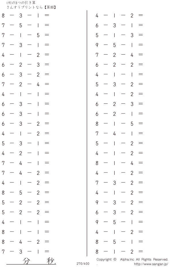 上記のボタンから「1桁の3つの引き算」の算数数学ドリル・計算ドリル(PDFプリント)がダウンロードできます。個人利用は無料です(家庭以外での配布は有料です)。