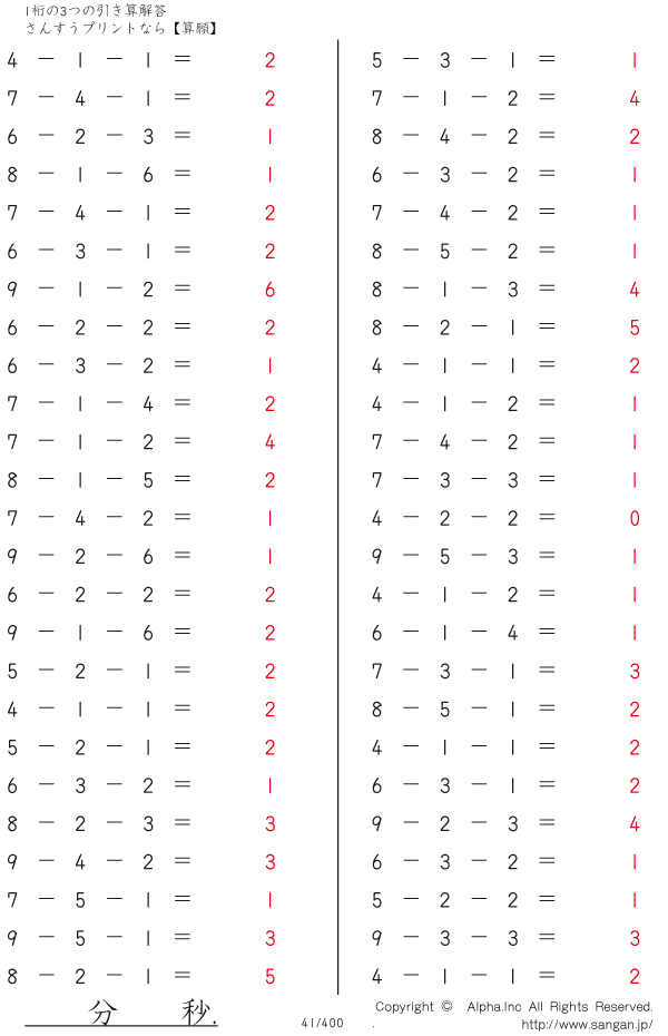 上記のボタンから「1桁の3つの引き算」の算数数学ドリル・計算ドリル(PDFプリント)がダウンロードできます。個人利用は無料です(家庭以外での配布は有料です)。