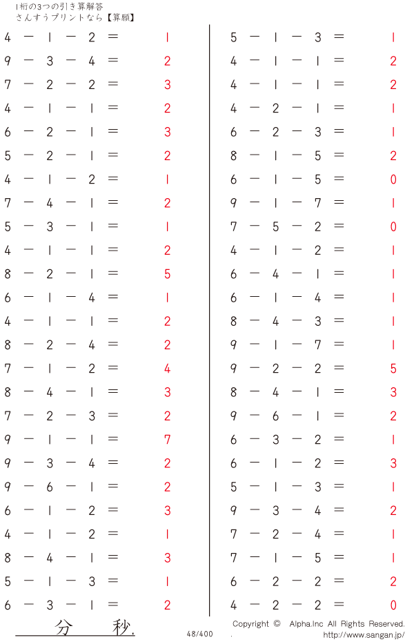 上記のボタンから「1桁の3つの引き算」の算数数学ドリル・計算ドリル(PDFプリント)がダウンロードできます。個人利用は無料です(家庭以外での配布は有料です)。