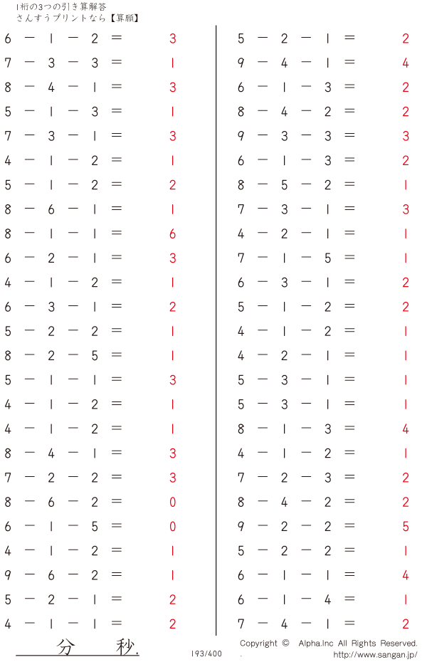 上記のボタンから「1桁の3つの引き算」の算数数学ドリル・計算ドリル(PDFプリント)がダウンロードできます。個人利用は無料です(家庭以外での配布は有料です)。