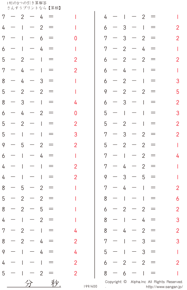 上記のボタンから「1桁の3つの引き算」の算数数学ドリル・計算ドリル(PDFプリント)がダウンロードできます。個人利用は無料です(家庭以外での配布は有料です)。