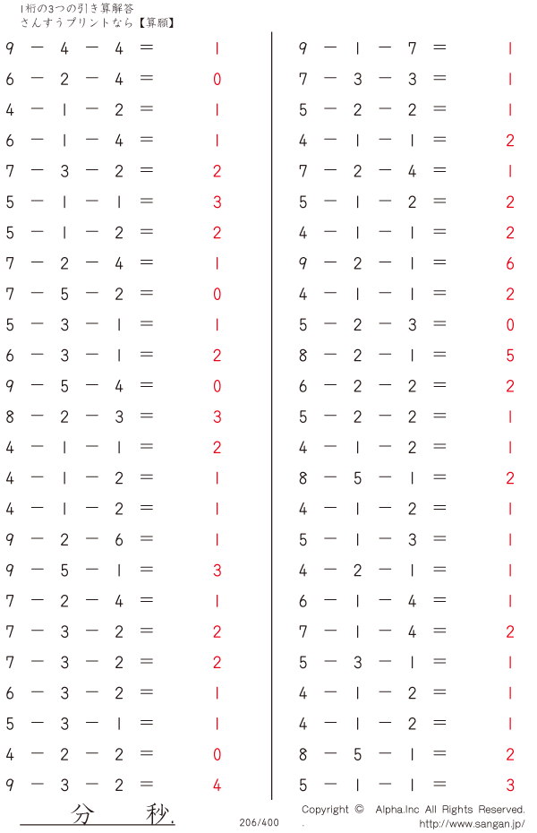 上記のボタンから「1桁の3つの引き算」の算数数学ドリル・計算ドリル(PDFプリント)がダウンロードできます。個人利用は無料です(家庭以外での配布は有料です)。