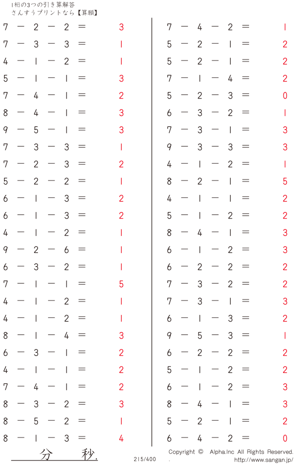 上記のボタンから「1桁の3つの引き算」の算数数学ドリル・計算ドリル(PDFプリント)がダウンロードできます。個人利用は無料です(家庭以外での配布は有料です)。