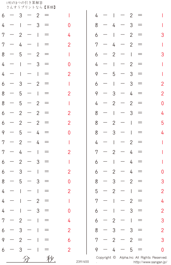 上記のボタンから「1桁の3つの引き算」の算数数学ドリル・計算ドリル(PDFプリント)がダウンロードできます。個人利用は無料です(家庭以外での配布は有料です)。