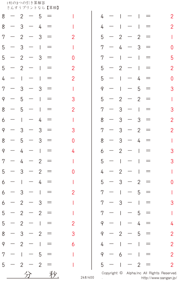 上記のボタンから「1桁の3つの引き算」の算数数学ドリル・計算ドリル(PDFプリント)がダウンロードできます。個人利用は無料です(家庭以外での配布は有料です)。