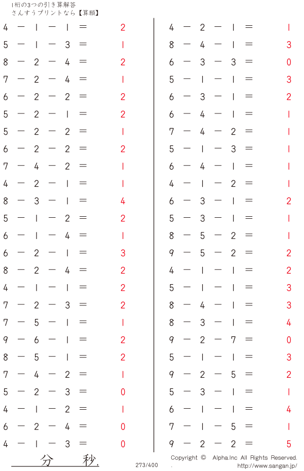 上記のボタンから「1桁の3つの引き算」の算数数学ドリル・計算ドリル(PDFプリント)がダウンロードできます。個人利用は無料です(家庭以外での配布は有料です)。