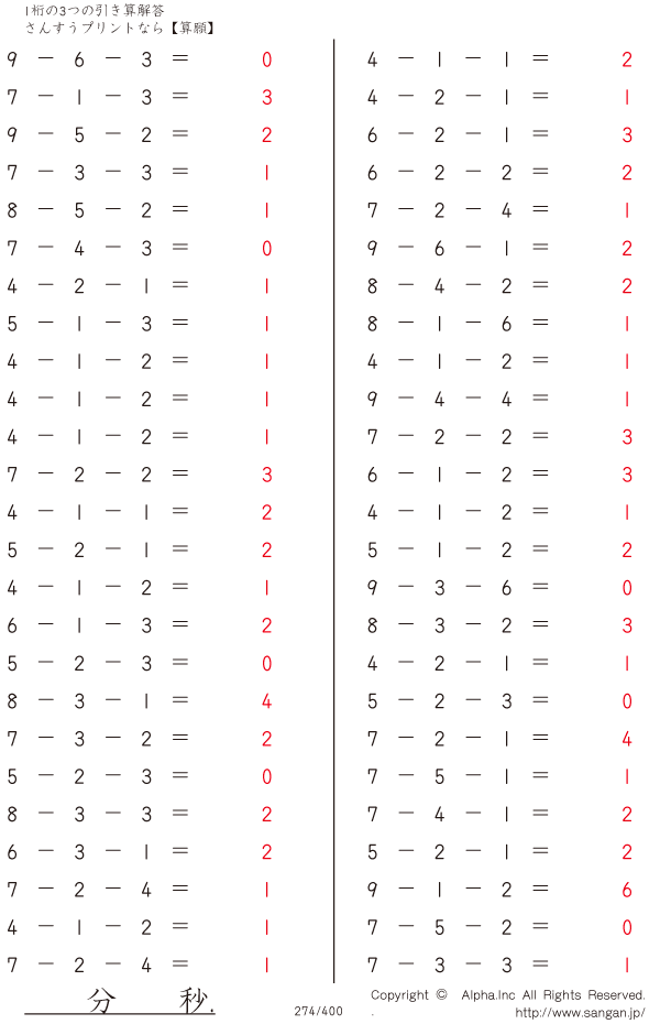 上記のボタンから「1桁の3つの引き算」の算数数学ドリル・計算ドリル(PDFプリント)がダウンロードできます。個人利用は無料です(家庭以外での配布は有料です)。