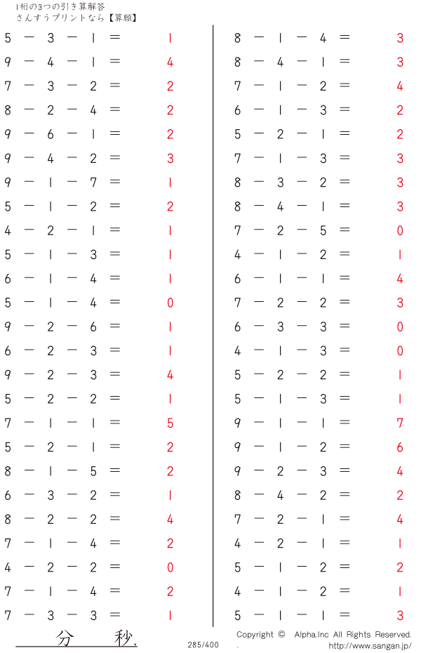上記のボタンから「1桁の3つの引き算」の算数数学ドリル・計算ドリル(PDFプリント)がダウンロードできます。個人利用は無料です(家庭以外での配布は有料です)。