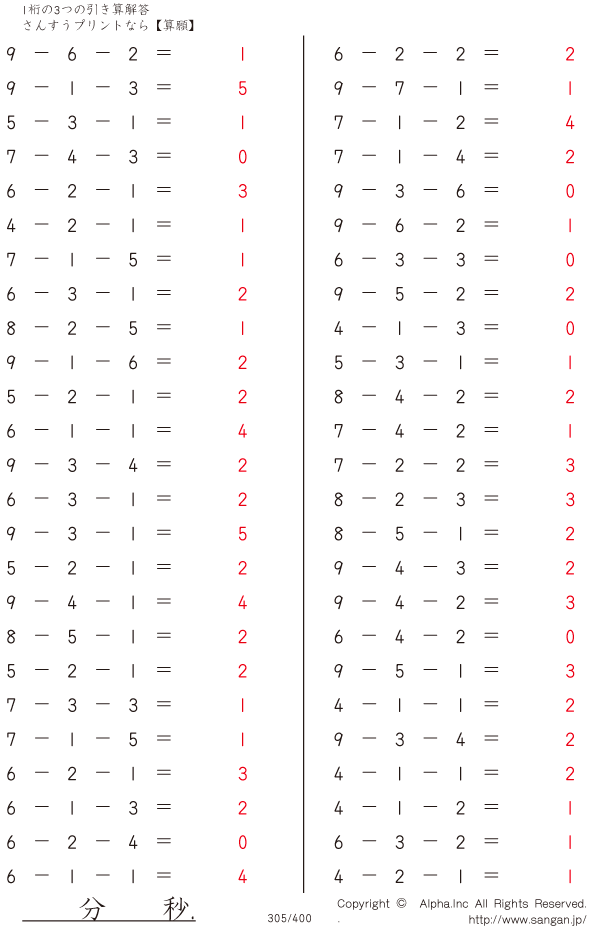 上記のボタンから「1桁の3つの引き算」の算数数学ドリル・計算ドリル(PDFプリント)がダウンロードできます。個人利用は無料です(家庭以外での配布は有料です)。