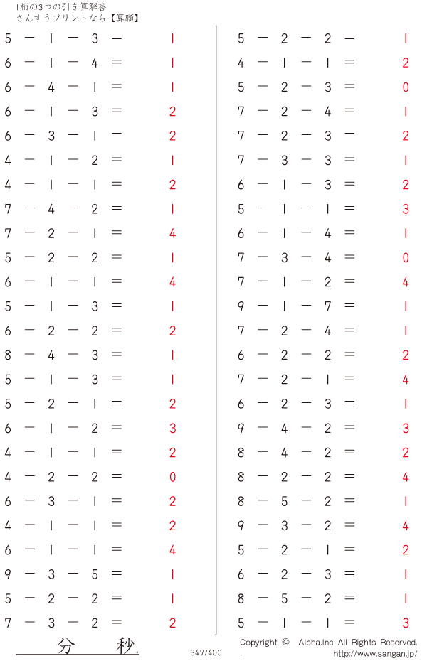 上記のボタンから「1桁の3つの引き算」の算数数学ドリル・計算ドリル(PDFプリント)がダウンロードできます。個人利用は無料です(家庭以外での配布は有料です)。