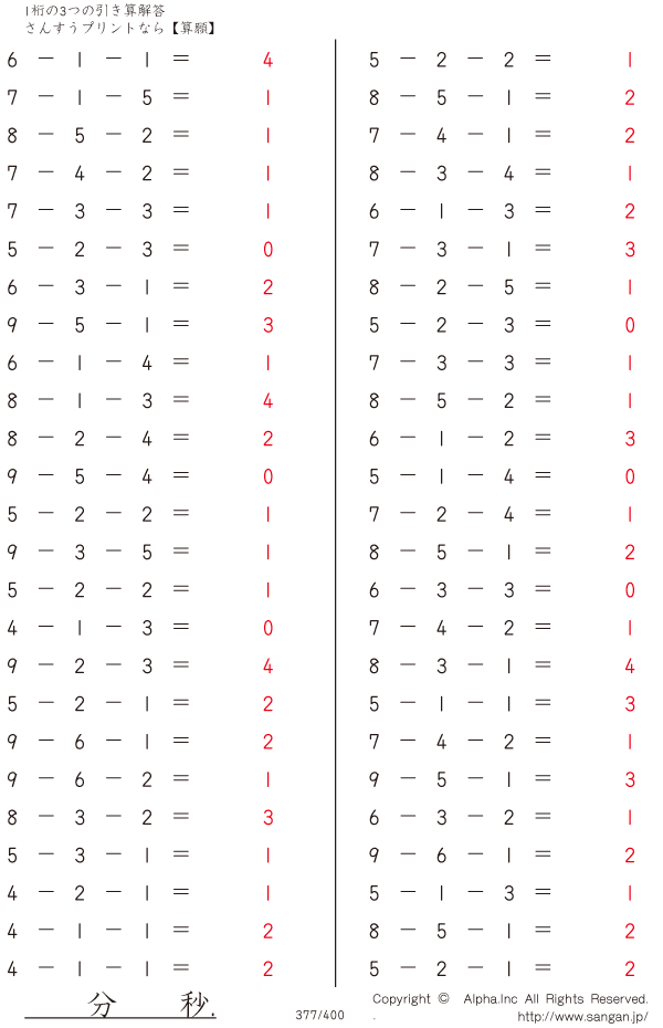 上記のボタンから「1桁の3つの引き算」の算数数学ドリル・計算ドリル(PDFプリント)がダウンロードできます。個人利用は無料です(家庭以外での配布は有料です)。