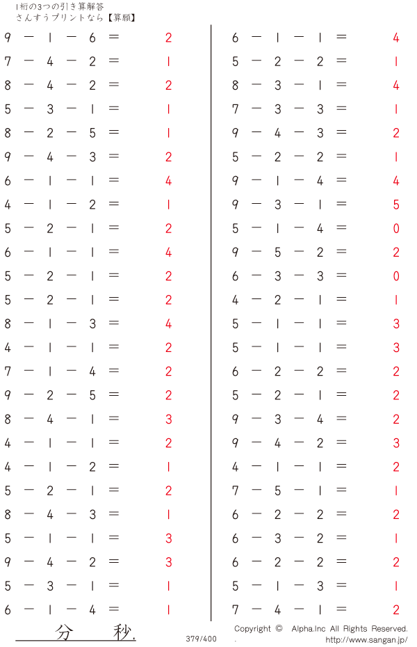 上記のボタンから「1桁の3つの引き算」の算数数学ドリル・計算ドリル(PDFプリント)がダウンロードできます。個人利用は無料です(家庭以外での配布は有料です)。
