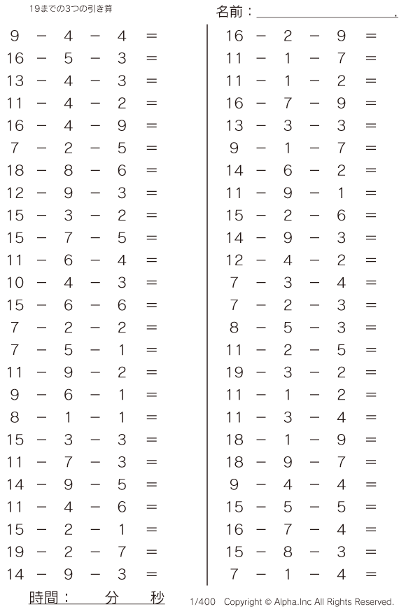 上記のボタンから「19までの3つの引き算」の算数数学ドリル・計算ドリル(PDFプリント)がダウンロードできます。個人利用は無料です(家庭以外での配布は有料です)。