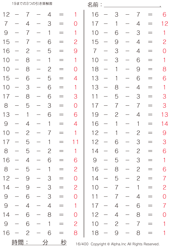 上記のボタンから「19までの3つの引き算」の算数数学ドリル・計算ドリル(PDFプリント)がダウンロードできます。個人利用は無料です(家庭以外での配布は有料です)。