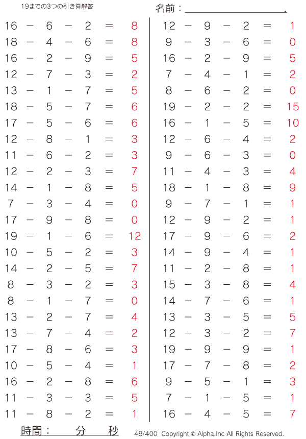 上記のボタンから「19までの3つの引き算」の算数数学ドリル・計算ドリル(PDFプリント)がダウンロードできます。個人利用は無料です(家庭以外での配布は有料です)。