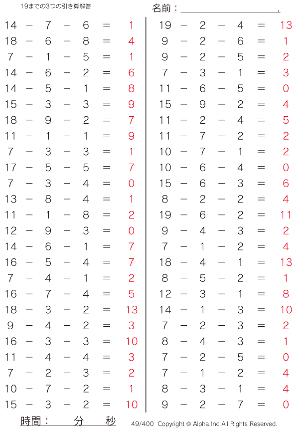 19までの3つの引き算 [解答]049/400