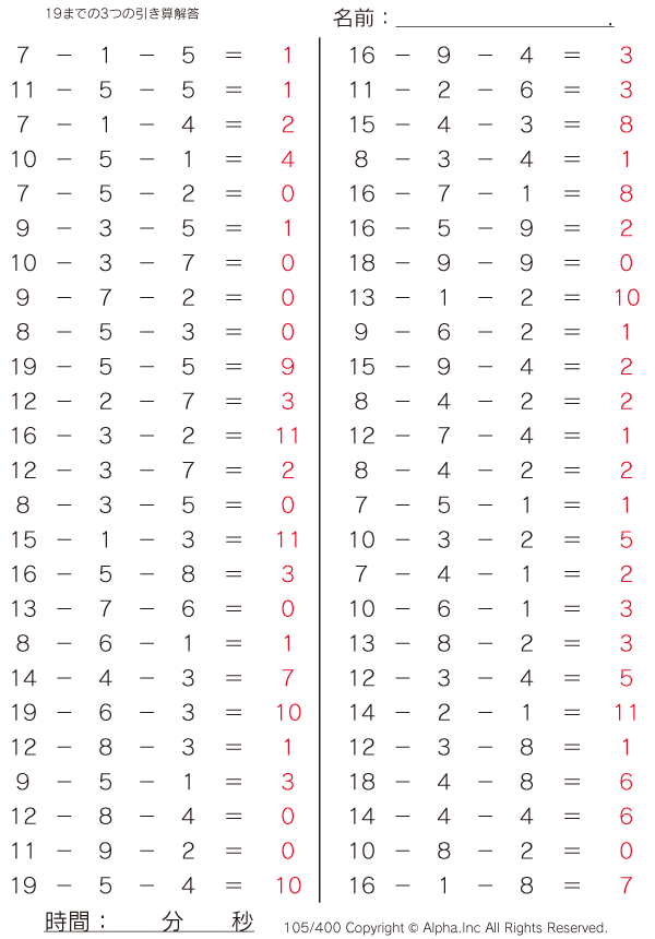 上記のボタンから「19までの3つの引き算」の算数数学ドリル・計算ドリル(PDFプリント)がダウンロードできます。個人利用は無料です(家庭以外での配布は有料です)。