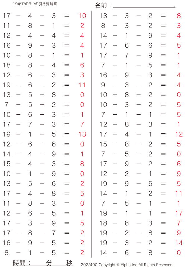上記のボタンから「19までの3つの引き算」の算数数学ドリル・計算ドリル(PDFプリント)がダウンロードできます。個人利用は無料です(家庭以外での配布は有料です)。