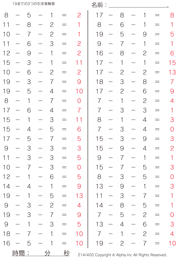 上記のボタンから「19までの3つの引き算」の算数数学ドリル・計算ドリル(PDFプリント)がダウンロードできます。個人利用は無料です(家庭以外での配布は有料です)。