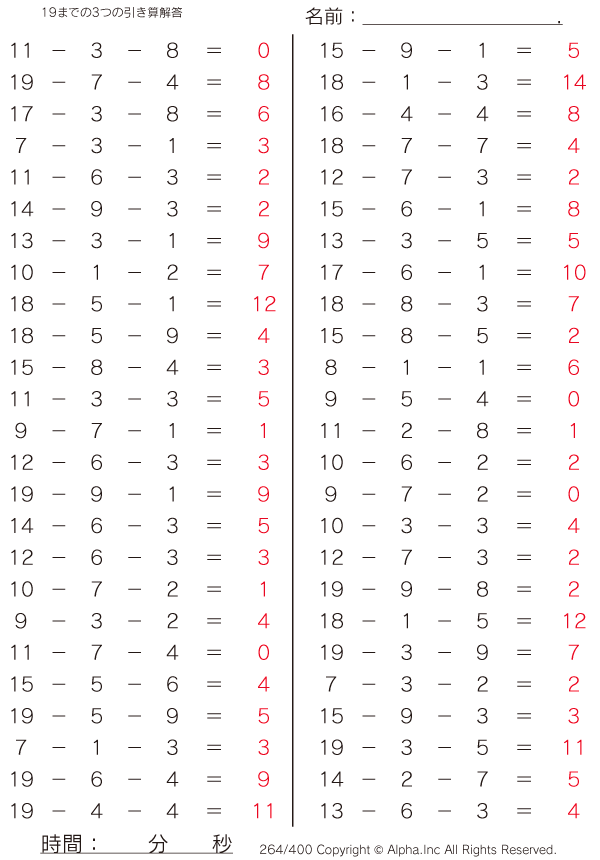上記のボタンから「19までの3つの引き算」の算数数学ドリル・計算ドリル(PDFプリント)がダウンロードできます。個人利用は無料です(家庭以外での配布は有料です)。
