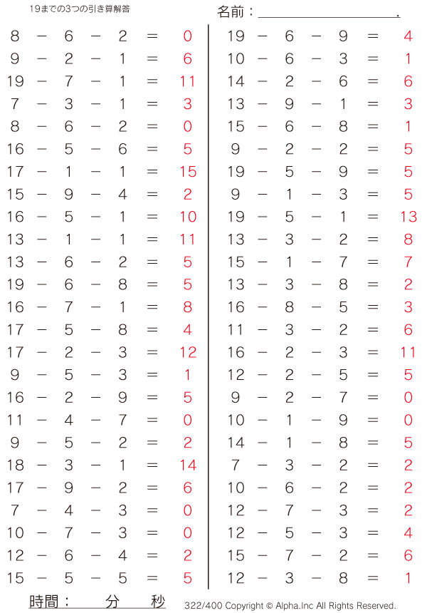 上記のボタンから「19までの3つの引き算」の算数数学ドリル・計算ドリル(PDFプリント)がダウンロードできます。個人利用は無料です(家庭以外での配布は有料です)。