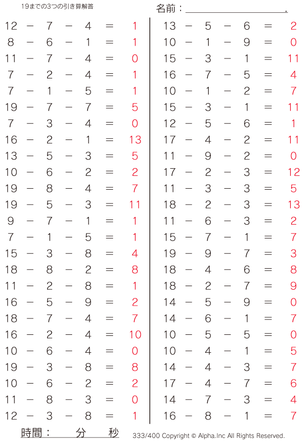 19までの3つの引き算 [解答]333/400