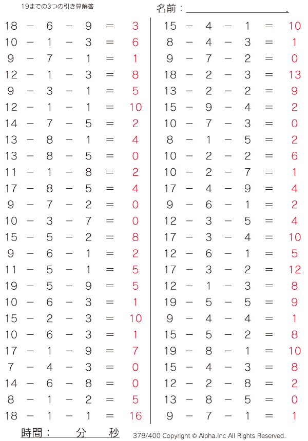 上記のボタンから「19までの3つの引き算」の算数数学ドリル・計算ドリル(PDFプリント)がダウンロードできます。個人利用は無料です(家庭以外での配布は有料です)。