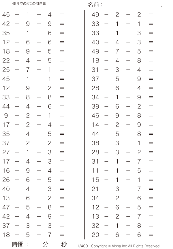 上記のボタンから「49までの3つの引き算」の算数数学ドリル・計算ドリル(PDFプリント)がダウンロードできます。個人利用は無料です(家庭以外での配布は有料です)。