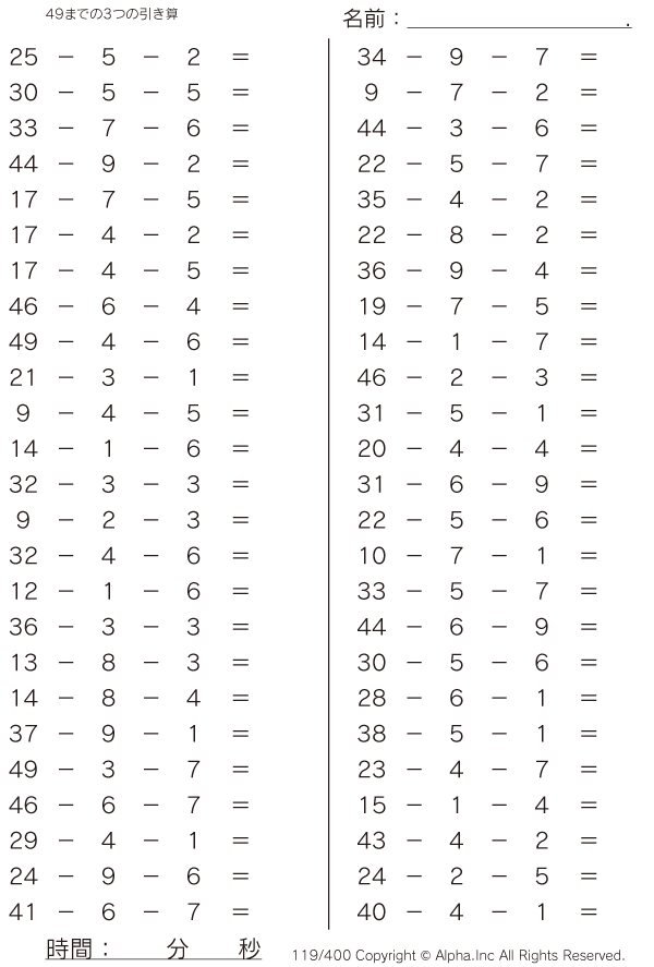 上記のボタンから「49までの3つの引き算」の算数数学ドリル・計算ドリル(PDFプリント)がダウンロードできます。個人利用は無料です(家庭以外での配布は有料です)。
