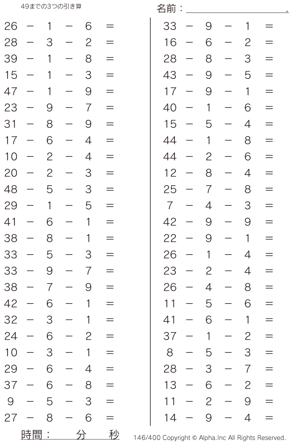上記のボタンから「49までの3つの引き算」の算数数学ドリル・計算ドリル(PDFプリント)がダウンロードできます。個人利用は無料です(家庭以外での配布は有料です)。