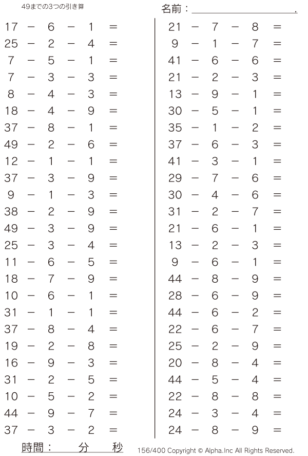 上記のボタンから「49までの3つの引き算」の算数数学ドリル・計算ドリル(PDFプリント)がダウンロードできます。個人利用は無料です(家庭以外での配布は有料です)。