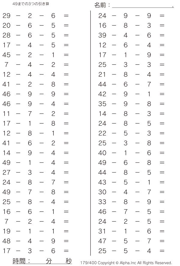 上記のボタンから「49までの3つの引き算」の算数数学ドリル・計算ドリル(PDFプリント)がダウンロードできます。個人利用は無料です(家庭以外での配布は有料です)。