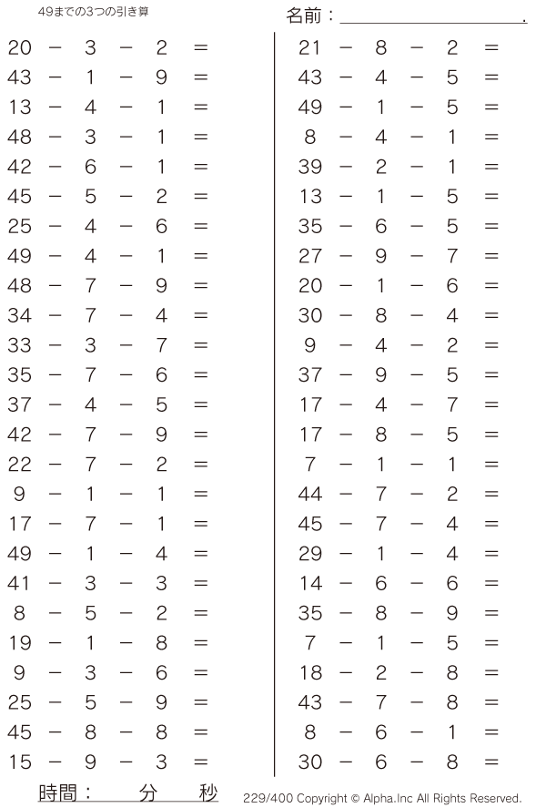 上記のボタンから「49までの3つの引き算」の算数数学ドリル・計算ドリル(PDFプリント)がダウンロードできます。個人利用は無料です(家庭以外での配布は有料です)。