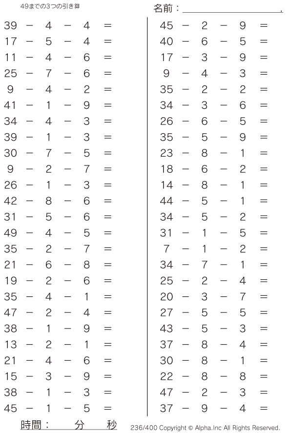 上記のボタンから「49までの3つの引き算」の算数数学ドリル・計算ドリル(PDFプリント)がダウンロードできます。個人利用は無料です(家庭以外での配布は有料です)。