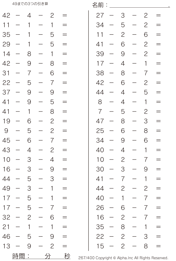 上記のボタンから「49までの3つの引き算」の算数数学ドリル・計算ドリル(PDFプリント)がダウンロードできます。個人利用は無料です(家庭以外での配布は有料です)。