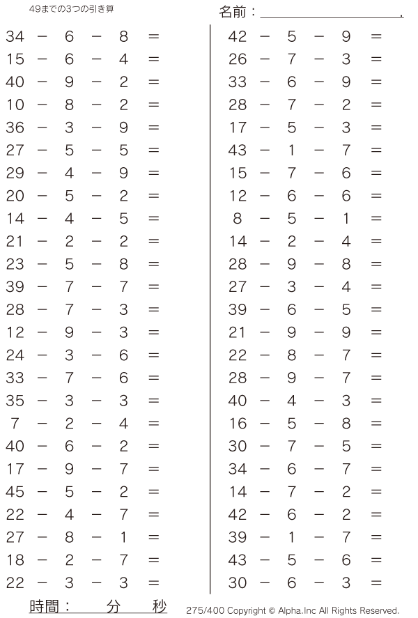 上記のボタンから「49までの3つの引き算」の算数数学ドリル・計算ドリル(PDFプリント)がダウンロードできます。個人利用は無料です(家庭以外での配布は有料です)。