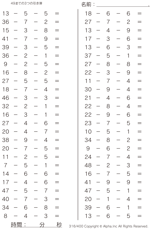 上記のボタンから「49までの3つの引き算」の算数数学ドリル・計算ドリル(PDFプリント)がダウンロードできます。個人利用は無料です(家庭以外での配布は有料です)。