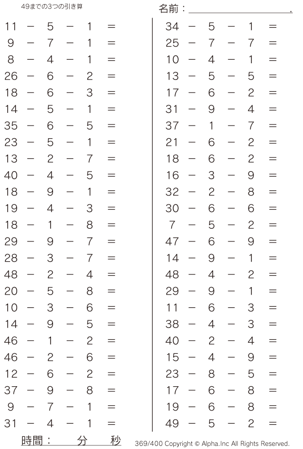 上記のボタンから「49までの3つの引き算」の算数数学ドリル・計算ドリル(PDFプリント)がダウンロードできます。個人利用は無料です(家庭以外での配布は有料です)。