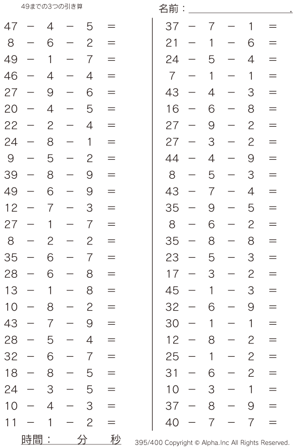 上記のボタンから「49までの3つの引き算」の算数数学ドリル・計算ドリル(PDFプリント)がダウンロードできます。個人利用は無料です(家庭以外での配布は有料です)。