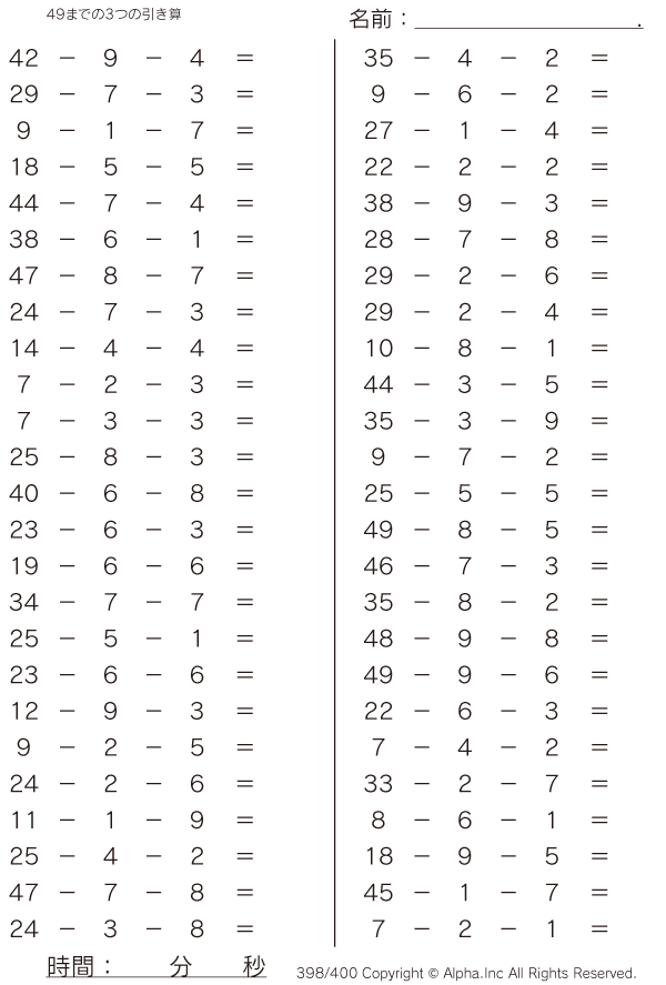 上記のボタンから「49までの3つの引き算」の算数数学ドリル・計算ドリル(PDFプリント)がダウンロードできます。個人利用は無料です(家庭以外での配布は有料です)。