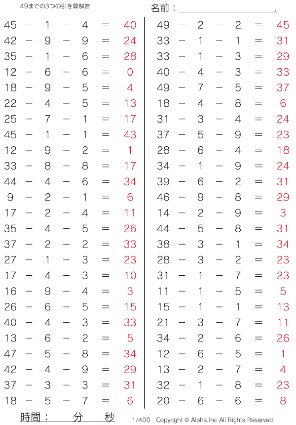 上記のボタンから「49までの3つの引き算」の算数数学ドリル・計算ドリル(PDFプリント)がダウンロードできます。個人利用は無料です(家庭以外での配布は有料です)。