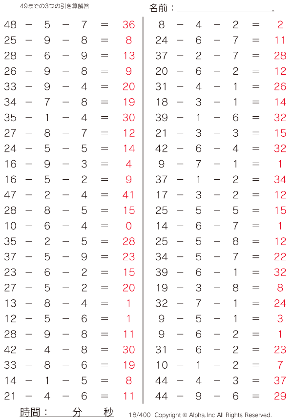 上記のボタンから「49までの3つの引き算」の算数数学ドリル・計算ドリル(PDFプリント)がダウンロードできます。個人利用は無料です(家庭以外での配布は有料です)。