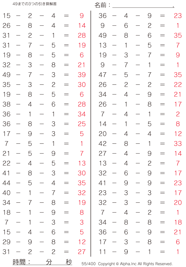 上記のボタンから「49までの3つの引き算」の算数数学ドリル・計算ドリル(PDFプリント)がダウンロードできます。個人利用は無料です(家庭以外での配布は有料です)。