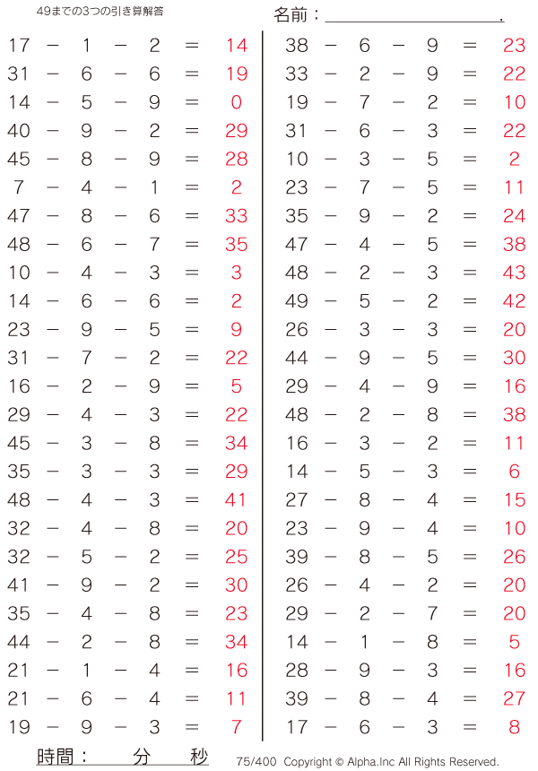 上記のボタンから「49までの3つの引き算」の算数数学ドリル・計算ドリル(PDFプリント)がダウンロードできます。個人利用は無料です(家庭以外での配布は有料です)。