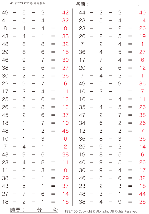上記のボタンから「49までの3つの引き算」の算数数学ドリル・計算ドリル(PDFプリント)がダウンロードできます。個人利用は無料です(家庭以外での配布は有料です)。