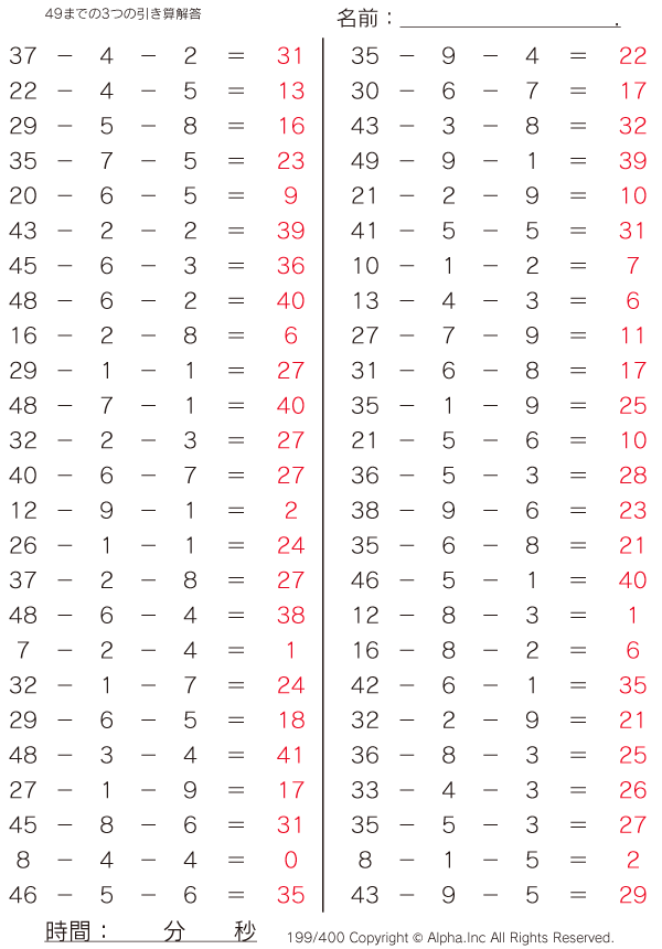 49までの3つの引き算 [解答]199/400