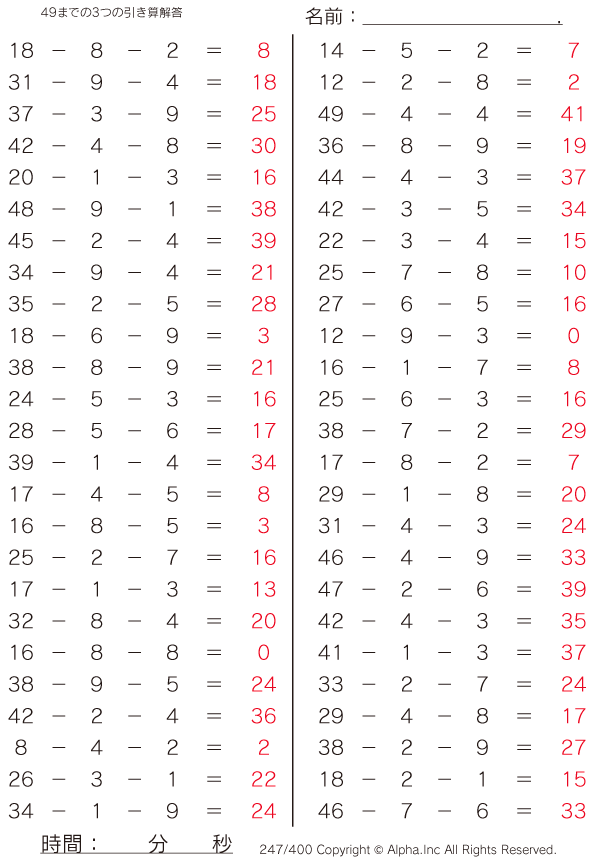 上記のボタンから「49までの3つの引き算」の算数数学ドリル・計算ドリル(PDFプリント)がダウンロードできます。個人利用は無料です(家庭以外での配布は有料です)。